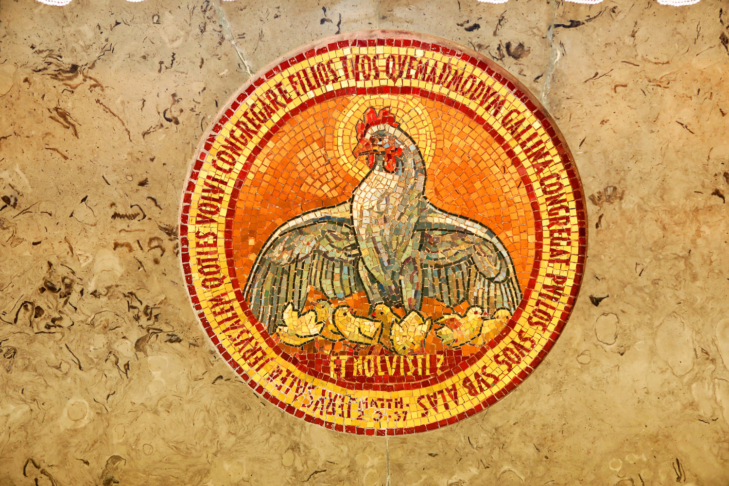 教堂內祭壇前的馬賽克畫,刻畫了母雞用它的翅膀保護一群小雞。