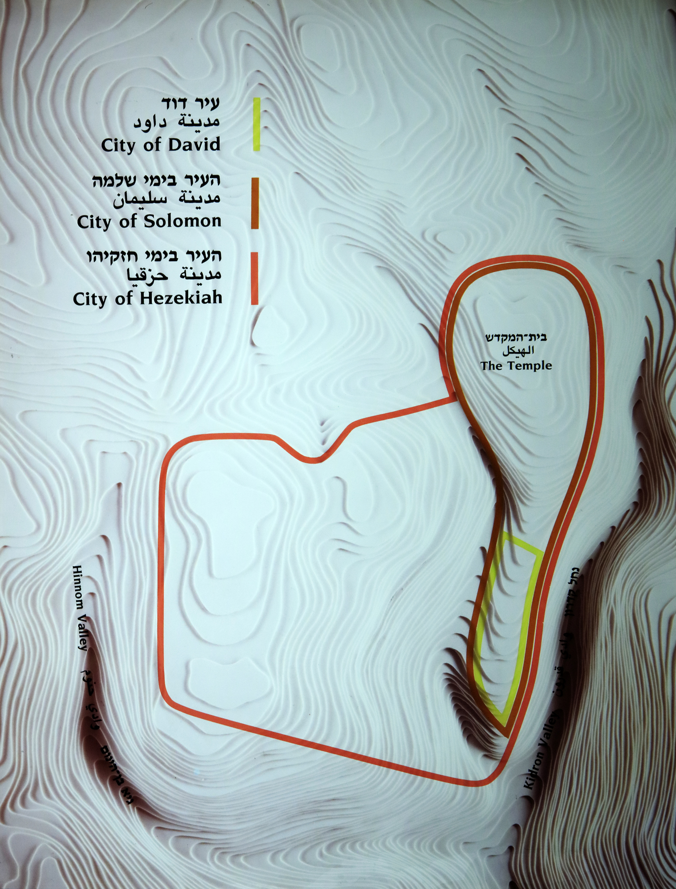 圖中黃色的範圍,是大衛城原本的大小。中間紅色的範圍,是所羅門時期的耶路撒冷城。外圍橙紅色的範圍,是希西家王時期的耶路撒冷。(耶路撒冷大衛塔博物館)
