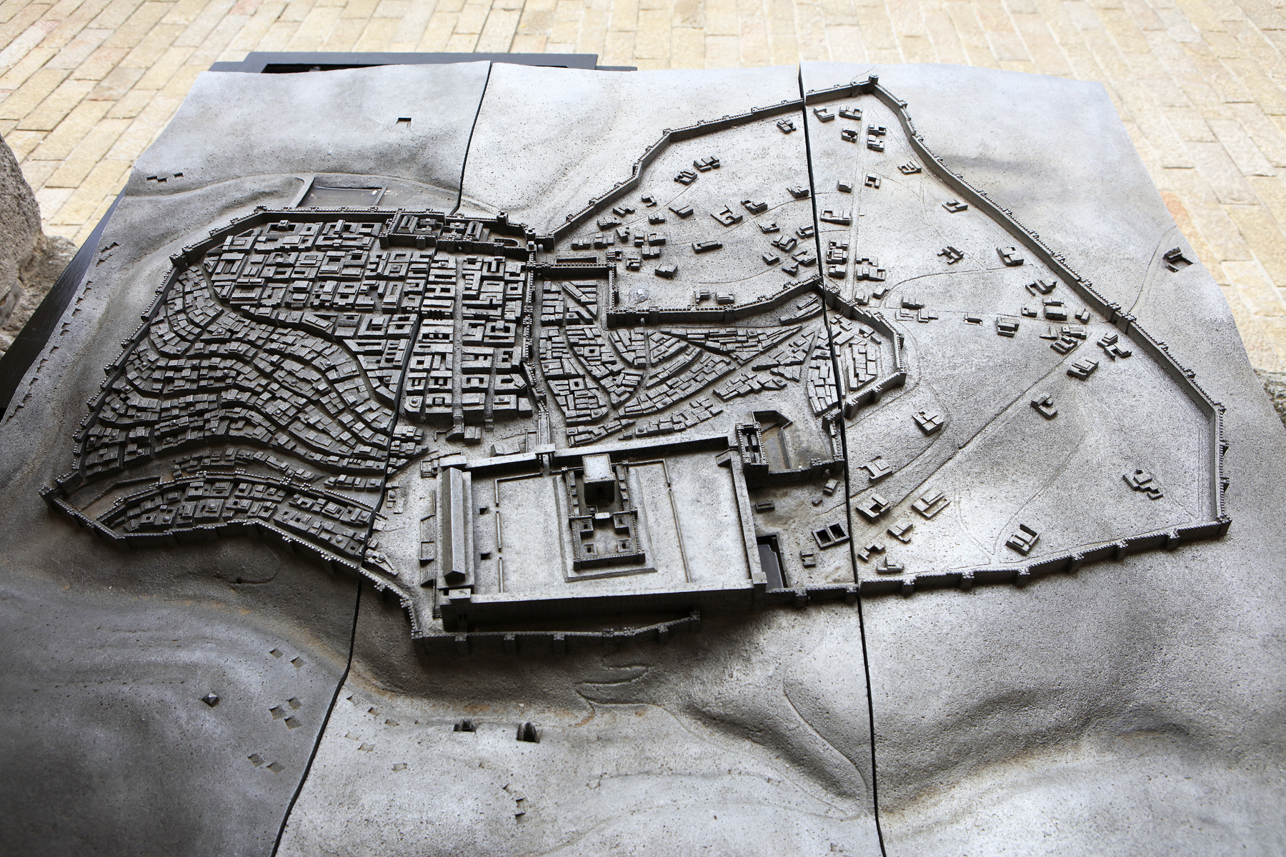 位於耶路撒冷西面、上城區城牆旁邊的大希律宮殿繪圖。耶穌被釘十字架之前,也曾在大希律的宮殿之內受審。(耶路撒冷大衛塔博物館)